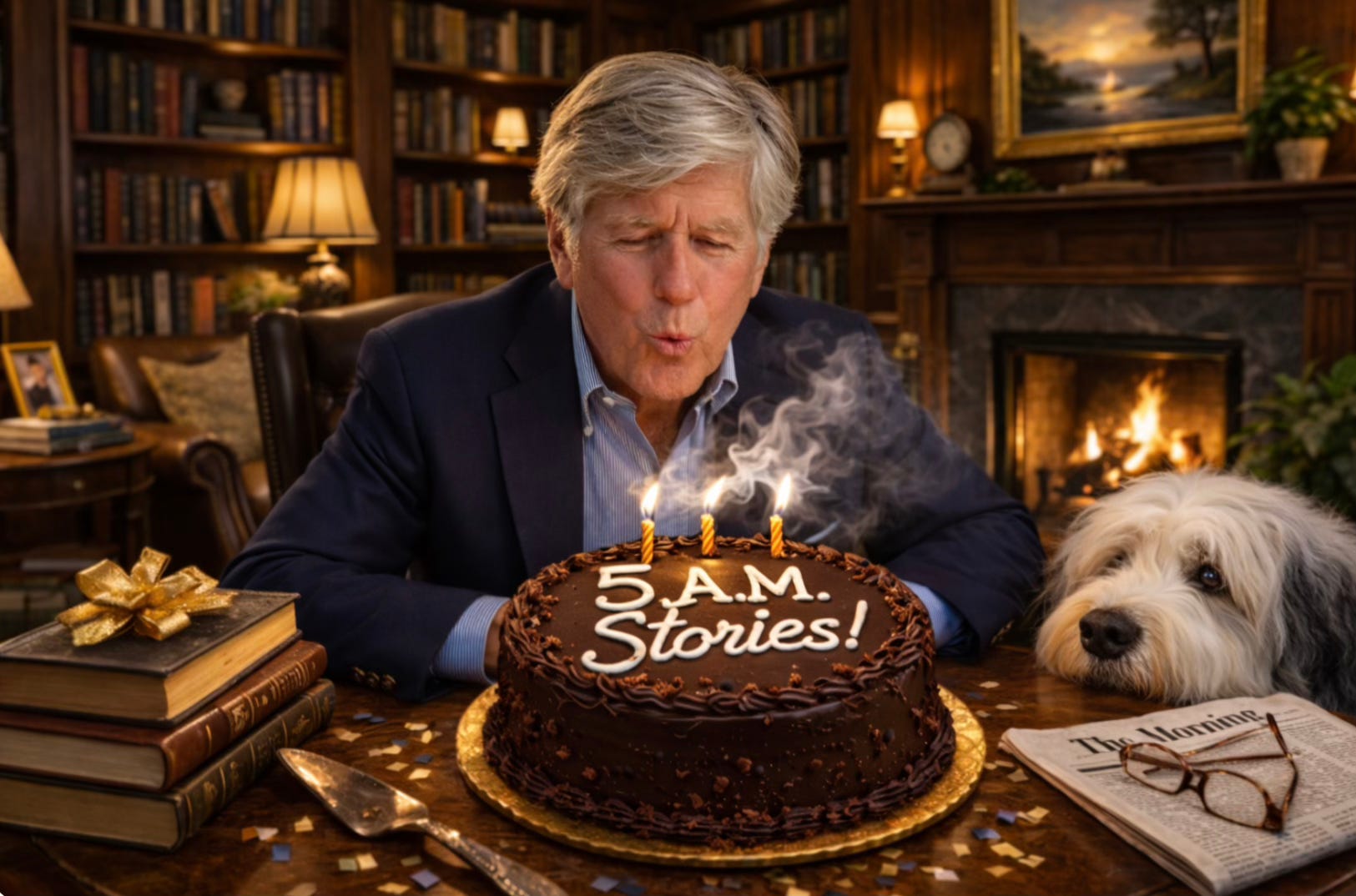 The photo atop this message shows me celebrating with Molly, our wonderful rescued Old English Sheepdog, who arrived at our house the same week as my 5 a.m. Stories were launched.