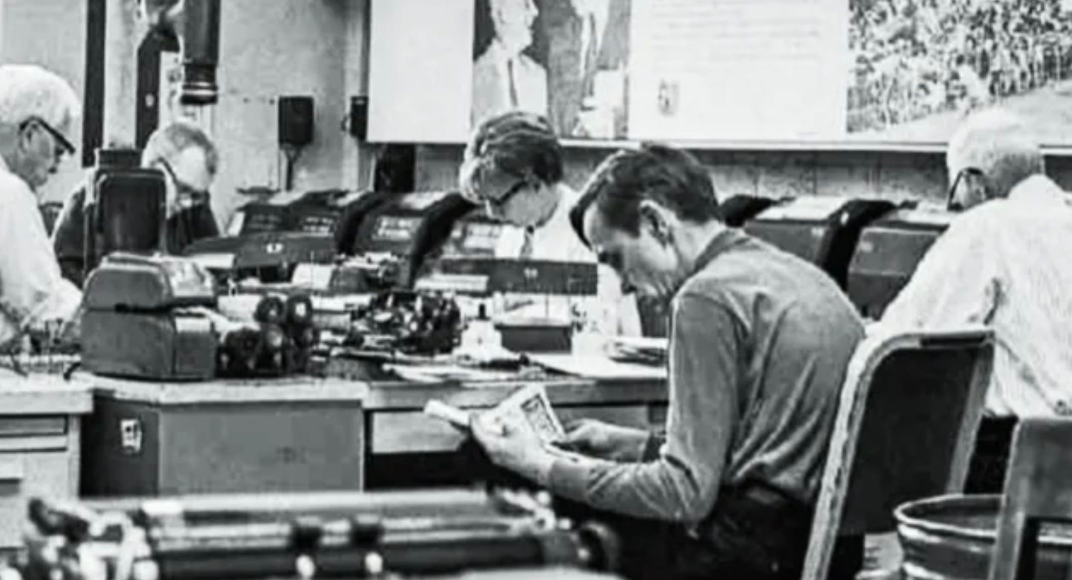 The News had six such machines, three for each wire service, but the most important two were for the “A-Wires,” where the really big news was going to pop up. Each of these machines was equipped with bells, to get the attention of everyone when a big story was breaking. The bigger the story, the more dinging there was.